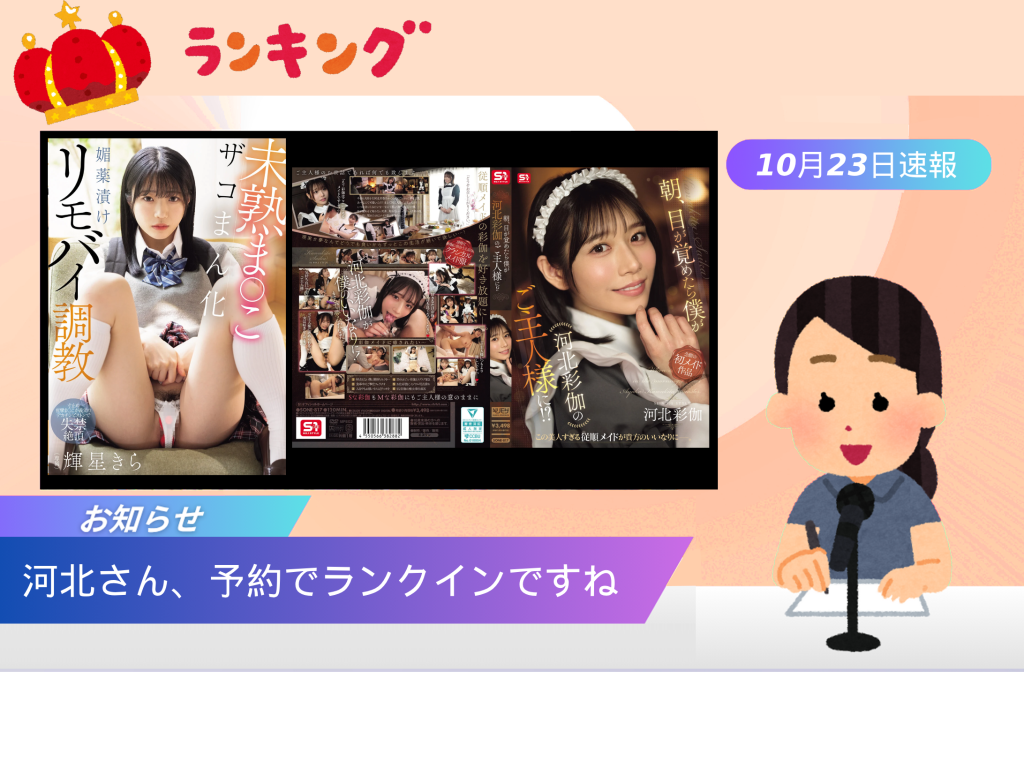 【10/23 デイリー速報】河北彩伽の予約作品が45位に初登場!輝星きらは1位へ!
