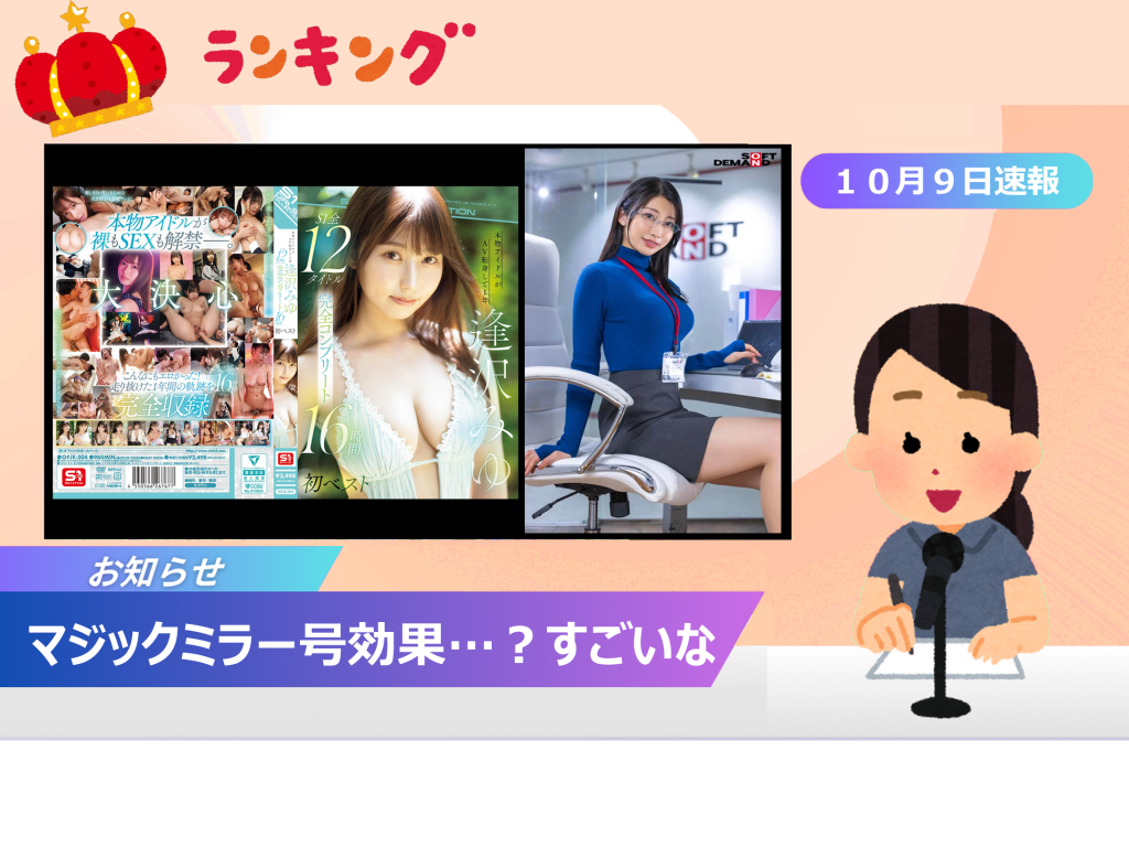 今日の注目ポイント 📈 逢沢みゆ効果が爆発!マジックミラー号の影響でベスト盤が急上昇!SODクリエイトの「マジックミラー号からの脱出!7」が2日連続で100ptを獲得し... -